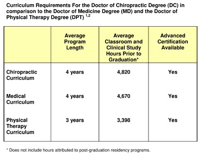 - Educational requirements for doctors of chiropractic are among the most stringent of any of the health care professions. The typical applicant at a chiropractic college has already acquired nearly four years of pre-medical undergraduate college education, including courses in biology, inorganic and organic chemistry, physics, psychology and related lab work. Once accepted into an accredited chiropractic college, the requirements become even more demanding — four to five academic years of professional study are the standard. Because of the hands-on nature of chiropractic, and the intricate adjusting techniques, a significant portion of time is spent in clinical training. Doctors of chiropractic — who are licensed to practice in all 50 states, the District of Columbia, and in many nations around the world — undergo a rigorous education in the healing sciences, similar to that of medical doctors. In some areas, such as anatomy, physiology, and rehabilitation, they receive more intensive education than most medical doctors or physical therapists.